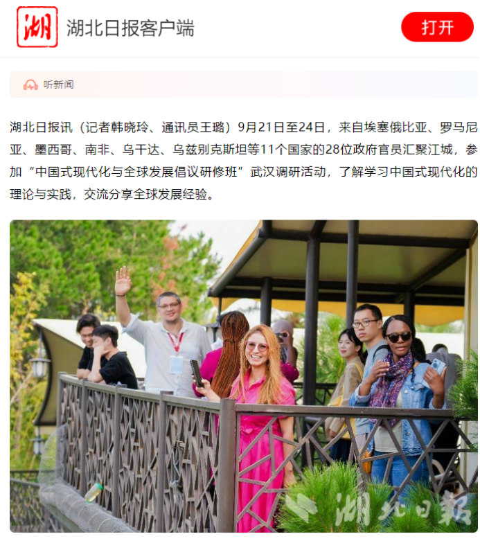 9月21日至24日,华中师范大学举行“中国式现代化与全球发展倡议研修班”武汉调研活动,本次研修班由商务部主办、北京大学习近平新时代中国特色社会主义思想研究院承办,政治学与国家治理研究院协办。来自埃塞俄比亚、罗马尼亚、墨西哥、南非、乌干达、乌兹别克斯坦等11个国家的28位政府官员汇聚江城,了解学习中国式现代化的理论与实践,交流分享全球发展经验。学员们走进武汉的城乡社区与创新前沿,深入考察湖北在乡村振兴、数字经济、人工智能和教育数字化等领域的生动实践。湖北日报关注报道了此次活动。