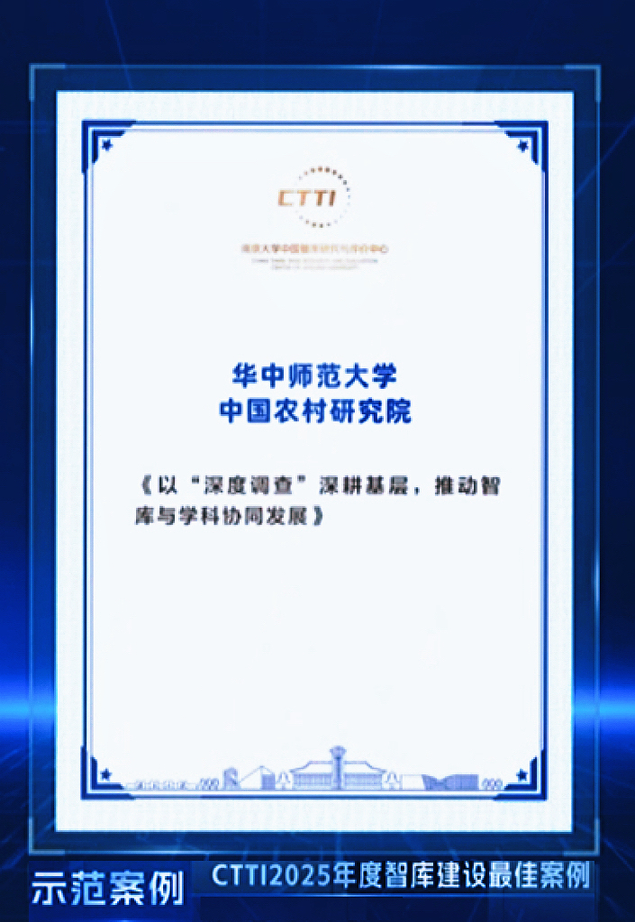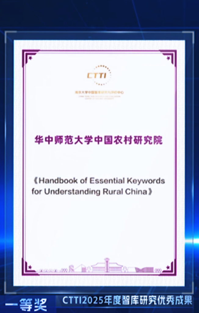 2025年11月21日,“2025新型智库治理论坛”在南京顺利召开。论坛以“中国特色新型智库建设回顾与‘十五五’展望”为主题,来自全国思想理论与智库管理部门、重点高校科研管理机构、CTTI来源智库及知名专家学者、主流媒体等500余位代表参会。会上,华中师范大学中国农村研究院再传喜讯——入选CTTI 2025年度高校智库百强榜A 等级,并荣获智库建设最佳案例“示范案例奖”1项,智库研究优秀成果特等奖1项、一等奖1项,创下我院历史佳绩。
