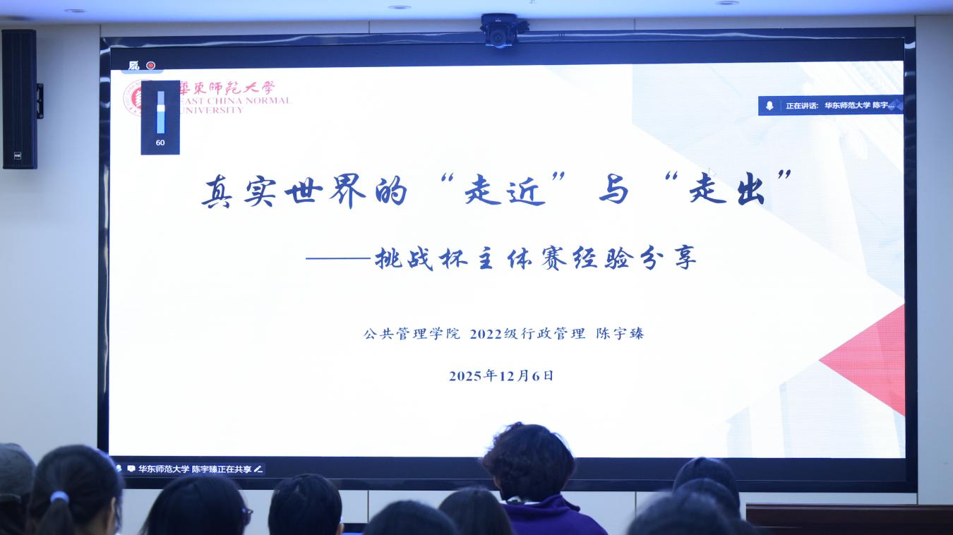 2025年12月6日下午,华中师范大学第三届“挑战杯”哲学社科训练营团队专题分享活动在文科科研楼持续开展。华东师范大学公共管理学院2022级本科生陈宇臻作为优秀获奖团队代表,以《走进真实世界:挑战杯主体赛备赛全攻略》为题,结合团队获奖项目《从“新农人”到“兴农人”:新型职业农民群体社会支持体系建构的困境与路径》,从选题、调研、撰写、答辩四大核心环节,为参训学子带来系统的备赛指导。