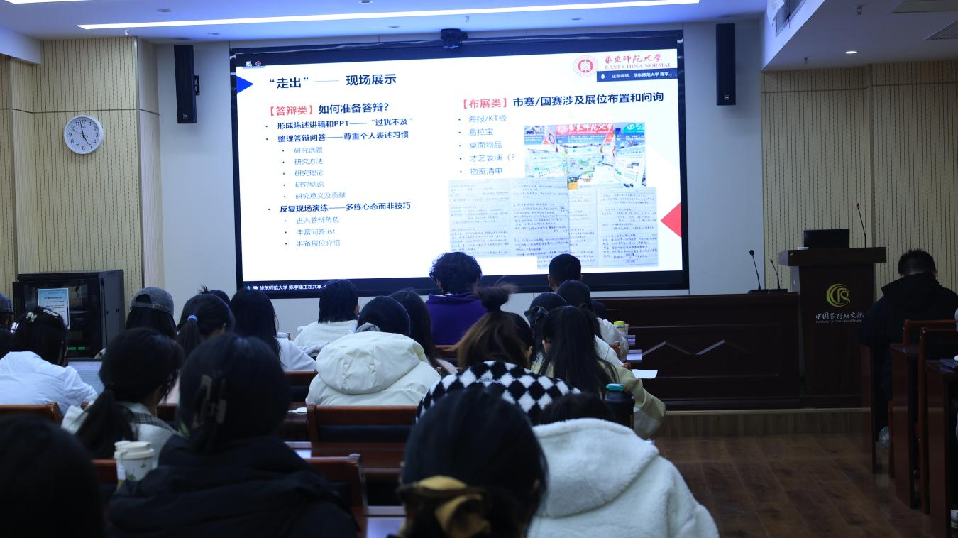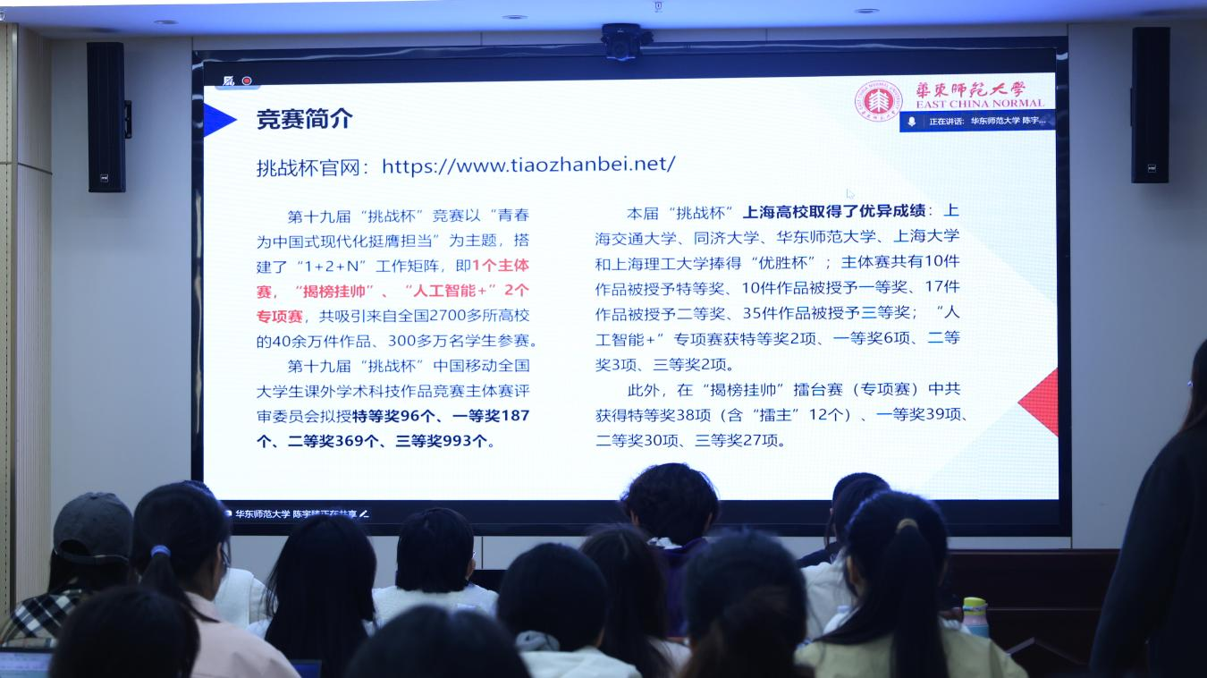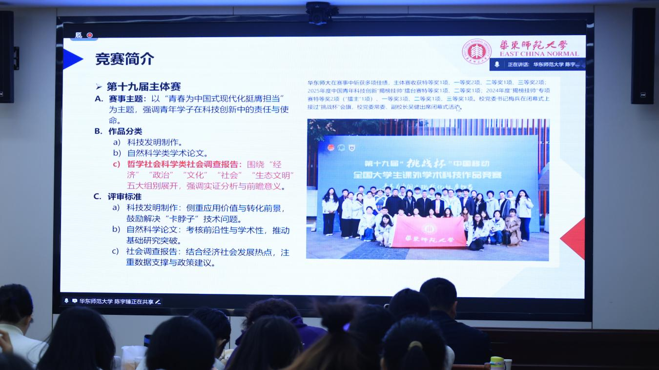 陈宇臻首先介绍了第19届“挑战杯”主体赛的赛事架构与时间流程,重点说明人文社科类学生核心参赛赛道——社会调查报告的竞争特点,以及校赛、市赛、国赛各阶段的关键节点与材料要求。他提到,华东师范大学将于2027年承办第20届“挑战杯”全国总决赛,鼓励学子把握赛事机遇,深耕学术实践。